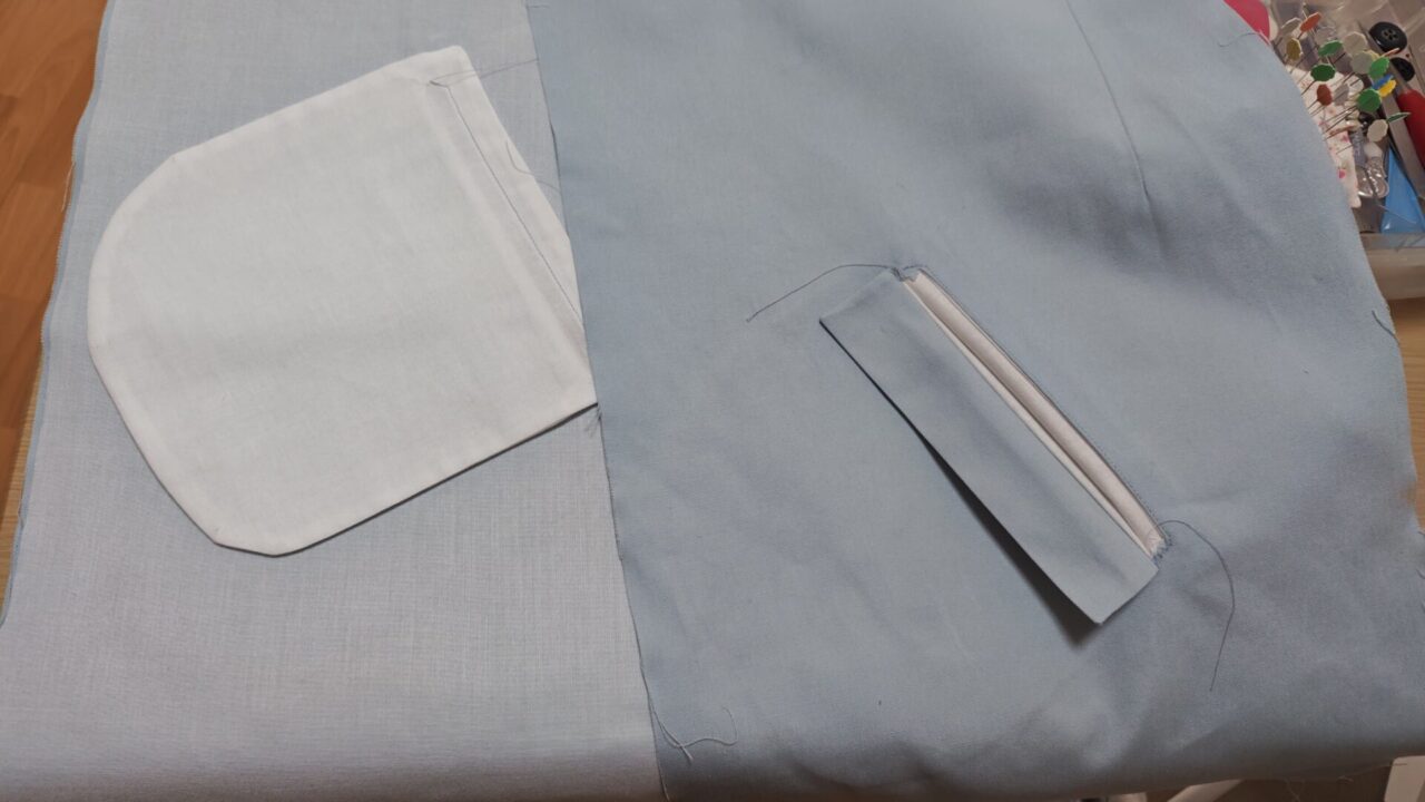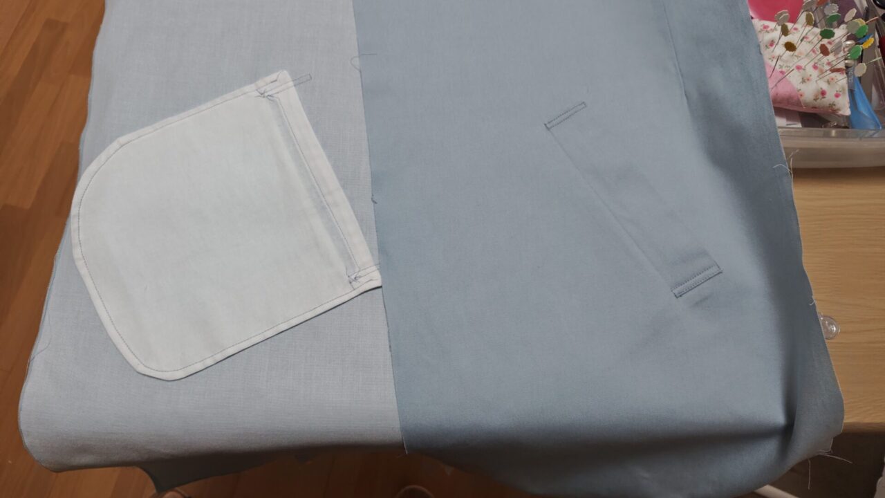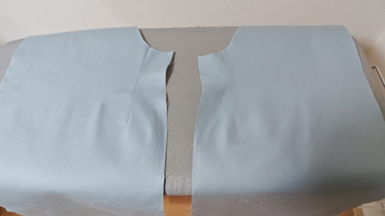 一生懸命作っていて写真を撮り忘れてしまい、後ろ身頃の中央縫い合わせ、布端のパイピング、センターベント仕上げの一連の工程写真が撮れていません。