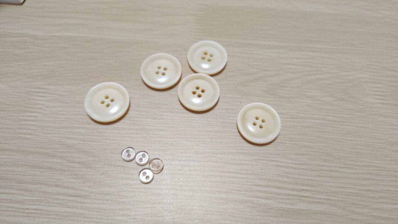 本当は23mm径のボタンがいいなと思っていましたが、管理人が行ったボタン屋さんには売っていませんでした。