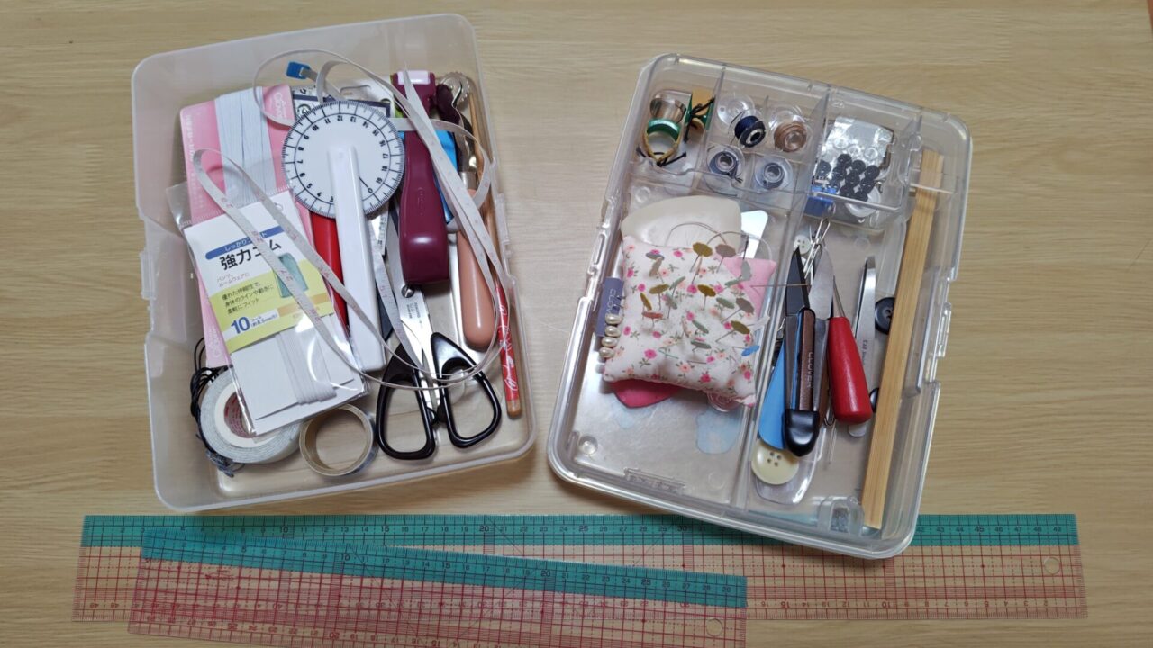 上段にはハサミ、マチ針、リッパー、チャコなど頻繁に使うもの、下段はコロコロメジャーや折り目付けローラーといった使用頻度は少ないけれどあれば便利なものが待機しています。