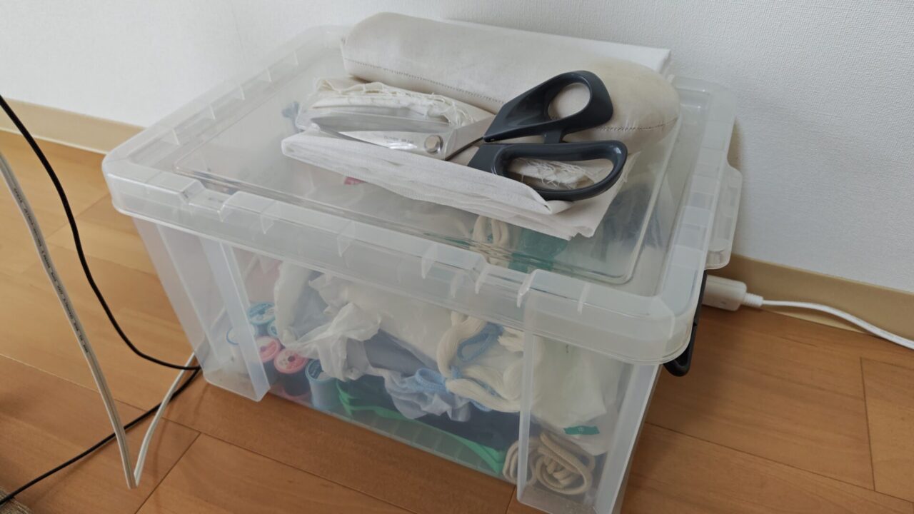 箱の上には裁ちバサミなどを置いてます。