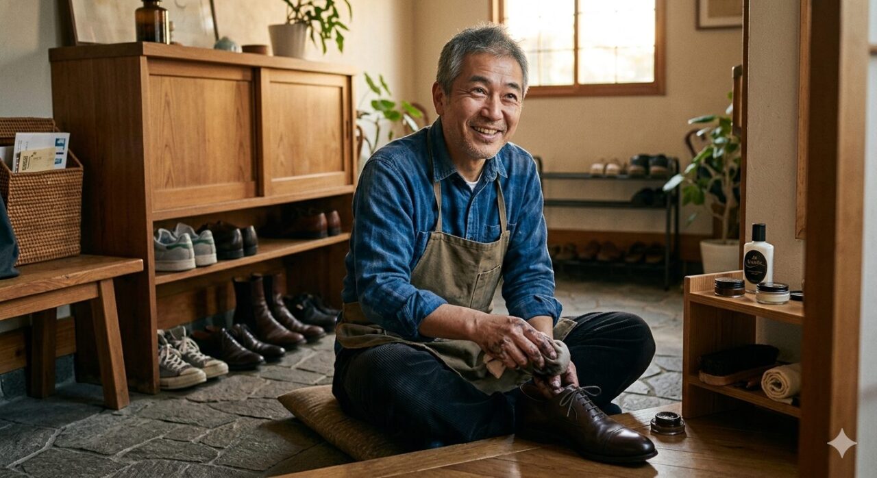 【※ 生成AIはおじさんを玄関の土足エリアに座布団で座らせて靴を床の上に置くイメージを作ったよ】
